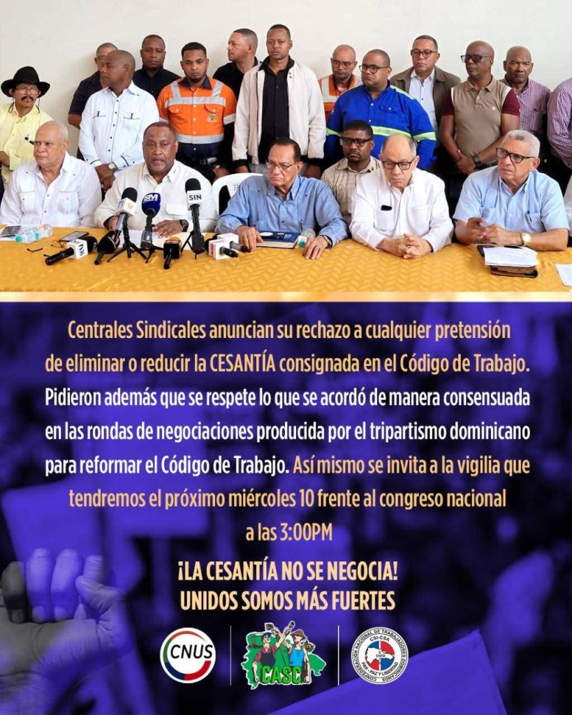 SANTO DOMINGO.– Las principales centrales sindicales del país anunciaron un plan de lucha contra la propuesta de reforma al esquema de pago de la cesantía, impulsada desde el sector empresarial. En rueda de prensa, los presidentes de la CNTD, CASC y CNUS —Jacobo Ramos, Gabriel del Río Doñé y Rafael “Pepe” Abreu— informaron que el […]